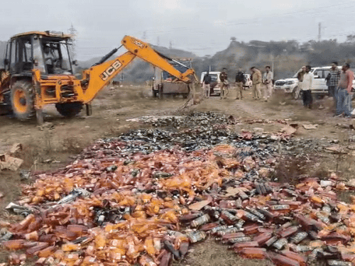 पंचकूला पुलिस ने चलाया 21 लाख की शराब पर बुलडोजर:2022 से 2025 के दौरान बरामद हुई अवैध शराब, अब कोर्ट के आदेश पर की डिस्पोज