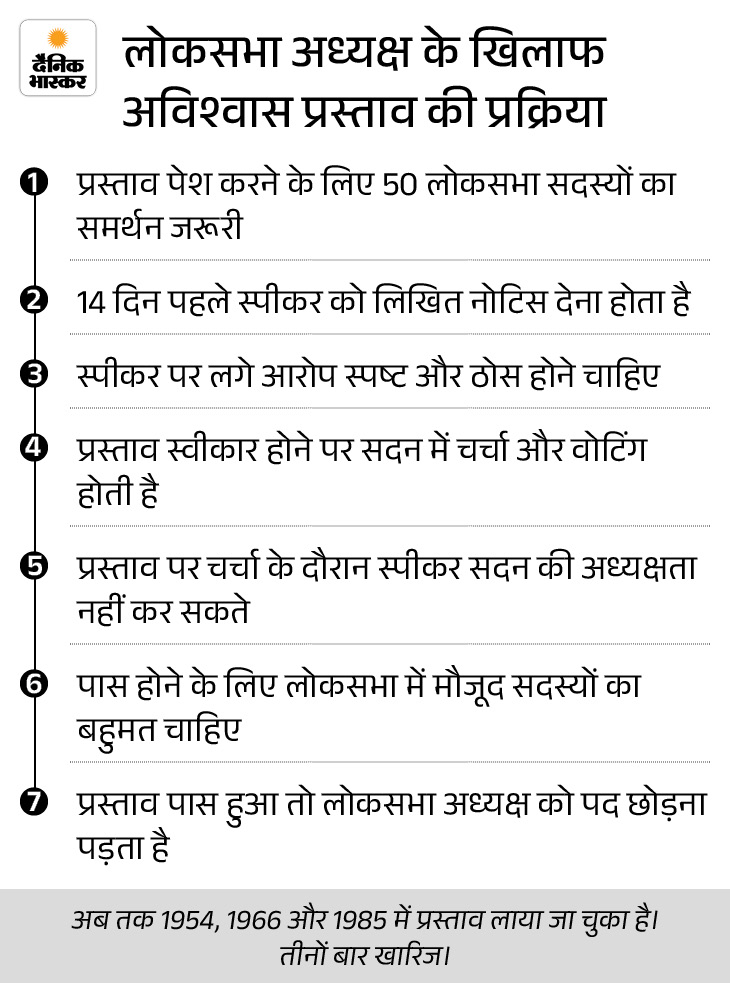इधर, लोकसभा स्पीकर ओम बिरला को पद से हटाने के लिए विपक्षी दल प्रस्ताव लाने की तैयारी कर रहे हैं। सूत्रों की मानें तो संविधान के अनुच्छेद 94-सी के तहत यह प्रस्ताव लाया जा सकता है। अब तक 103 सांसद इस पर हस्ताक्षर कर चुके हैं।