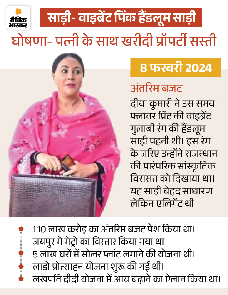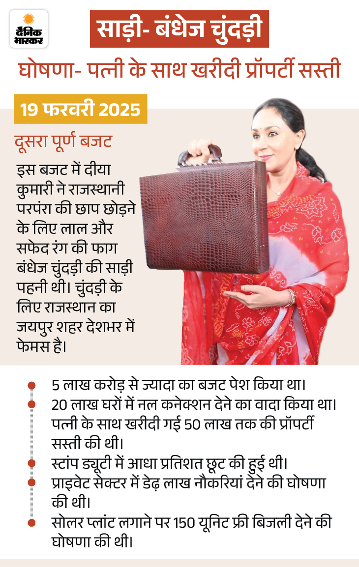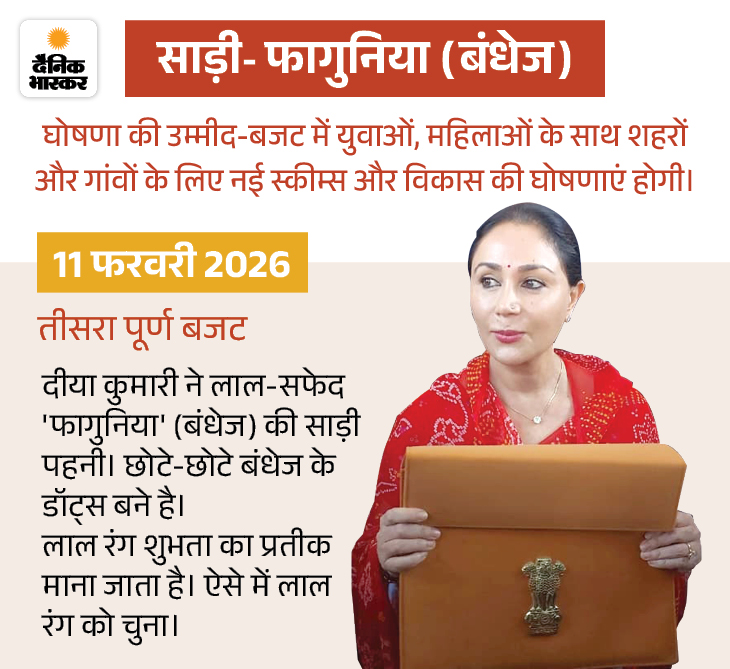 वित्त मंत्री दीया कुमारी ने लाल चुंदडी की साड़ी में बजट पेश किया। 19 फरवरी 2025 को लाल-सफेद रंग की फागुनिया बंधेज की साड़ी पहनी थीं। इस बार उन्होंने सेम पैटर्न रिपीट किया। लाल रंग से शुभता और बंधेज से राजस्थानी परपंरा की छाप छोड़ी।