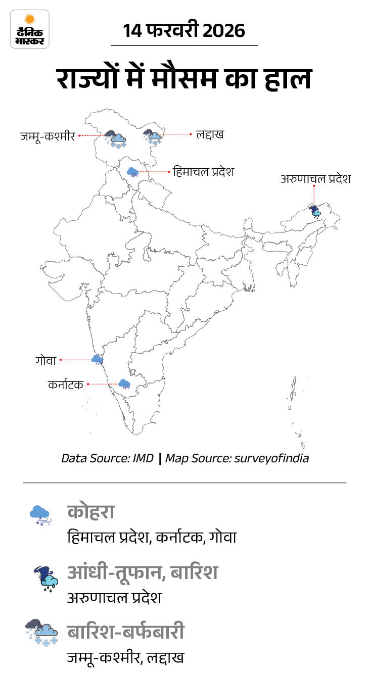 15 फरवरी- हिमाचल प्रदेश में कुछ जगहों पर घना कोहरा। अरुणाचल प्रदेश में कुछ जगहों पर आंधी-तूफान के साथ बारिश की आशंका। 16 फरवरी- जम्मू-कश्मीर और लद्दाख में बारिश-बर्फबारी की संभावना।