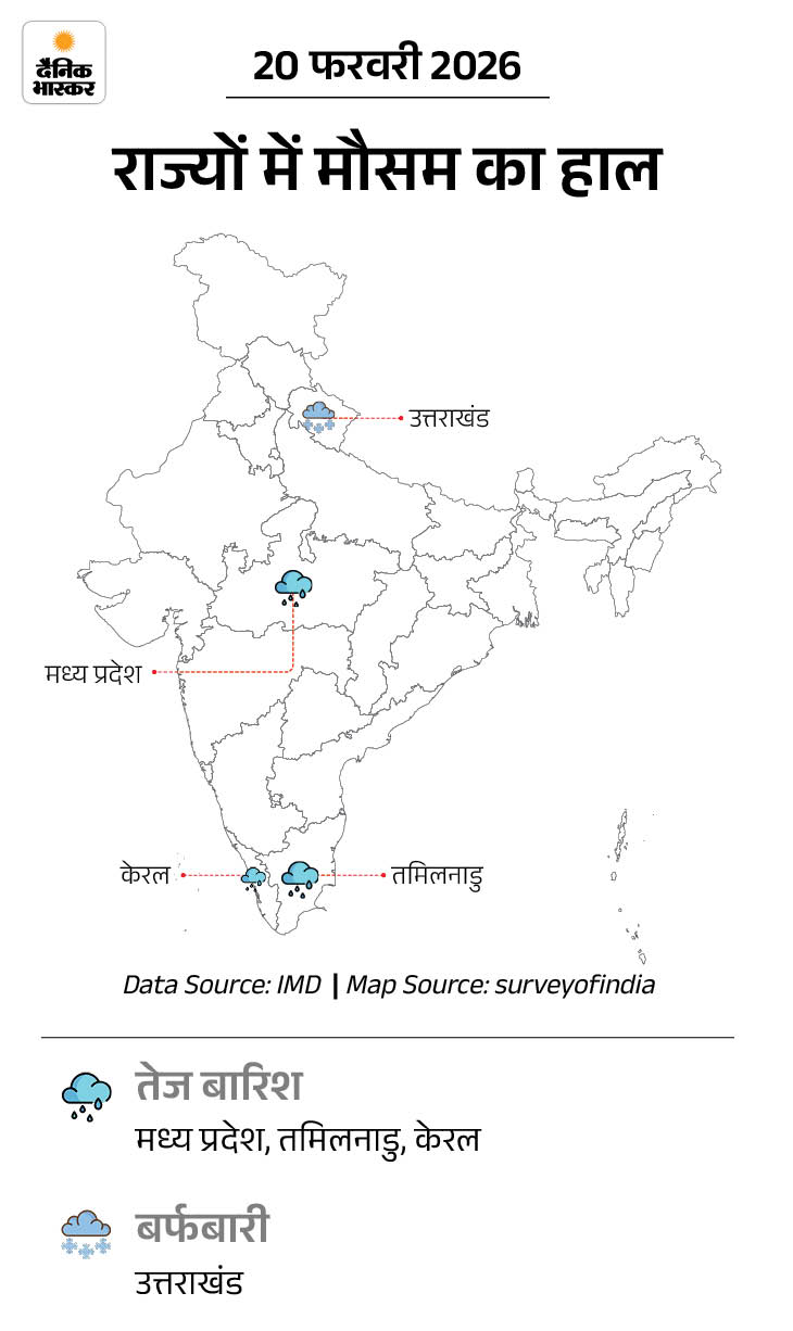 उत्तराखंड में 20 फरवरी को प्रदेश के सभी जिलों में मौसम शुष्क बना रहने की संभावना है। मौसम विभाग के अनुसार न्यूनतम तापमान में फिलहाल कोई बड़ा बदलाव नहीं होगा और प्रदेश में ठंड का असर जारी रहने की संभावना है। 19 फरवरी को प्रदेश के 3 जिलों में बर्फबारी हुई। इनमें पिथौरागढ़, बागेश्वर और रुद्रप्रयाग के ऊंचाई वाले इलाके शामिल हैं। इसके अलावा 7 जिलों में बारिश हुई।वहीं, 22 से 24 फरवरी तक 5 जिलों में बारिश और बर्फबारी की संभावना है। पूरी खबर पढ़ें…