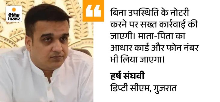 संघवी ने कहा कि राज्य में एक ऐसी व्यवस्था बनाई गई है, जिससे माता-पिता की अनुमति से विवाह करने वालों को और प्रेम विवाह में अपनी झूठी पहचान न दिखाने वालों को कोई परेशानी न हो। नई व्यवस्था में नोटरी का काम सभी की उपस्थिति में करना होगा।