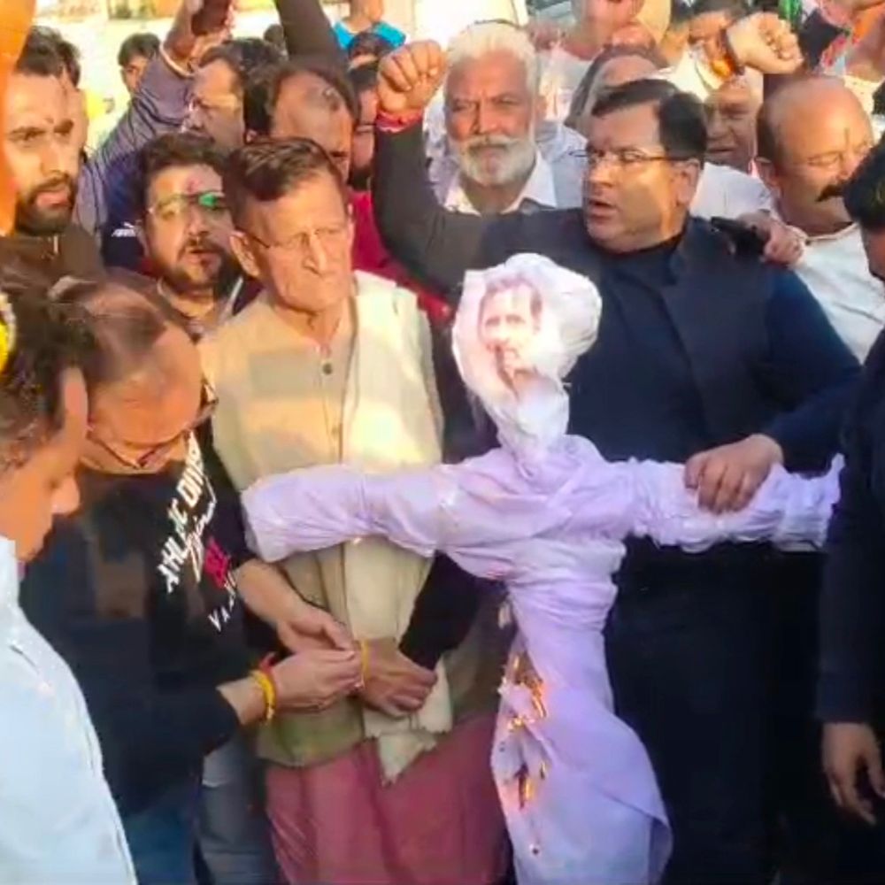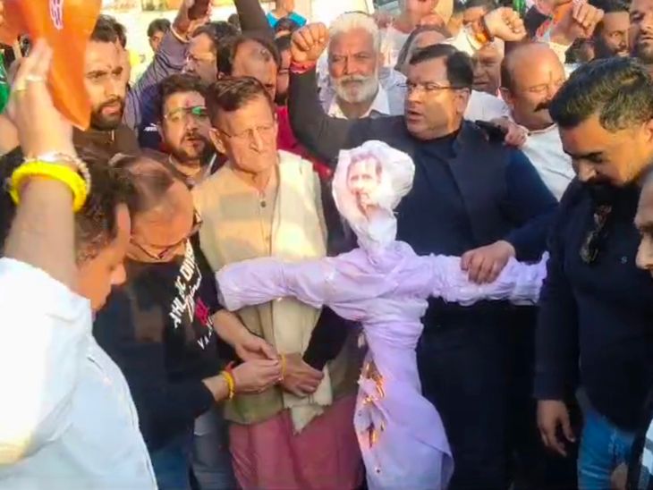 पठानकोट में भाजपा ने राहुल गांधी का पुतला फूंका:यूथ कांग्रेस के दिल्ली AI समिट प्रदर्शन पर जताया विरोध