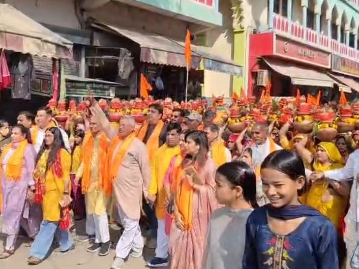 नूंह में महिलाओं ने निकाली कलश यात्रा:RSS के शताब्दी वर्ष के उपलक्ष्य में हिंदू सम्मेलन; सुरक्षा के पुख्ता इंतजाम