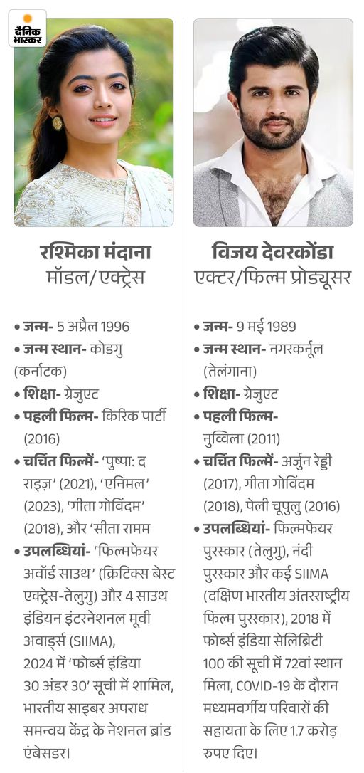 विजय देवरकोंडा और रश्मिका मंदाना दोनों साउथ फिल्म इंडस्ट्री के स्टार है। रश्मिका ने बॉलीवुड में भी कई हिट फिल्म दी हैं।