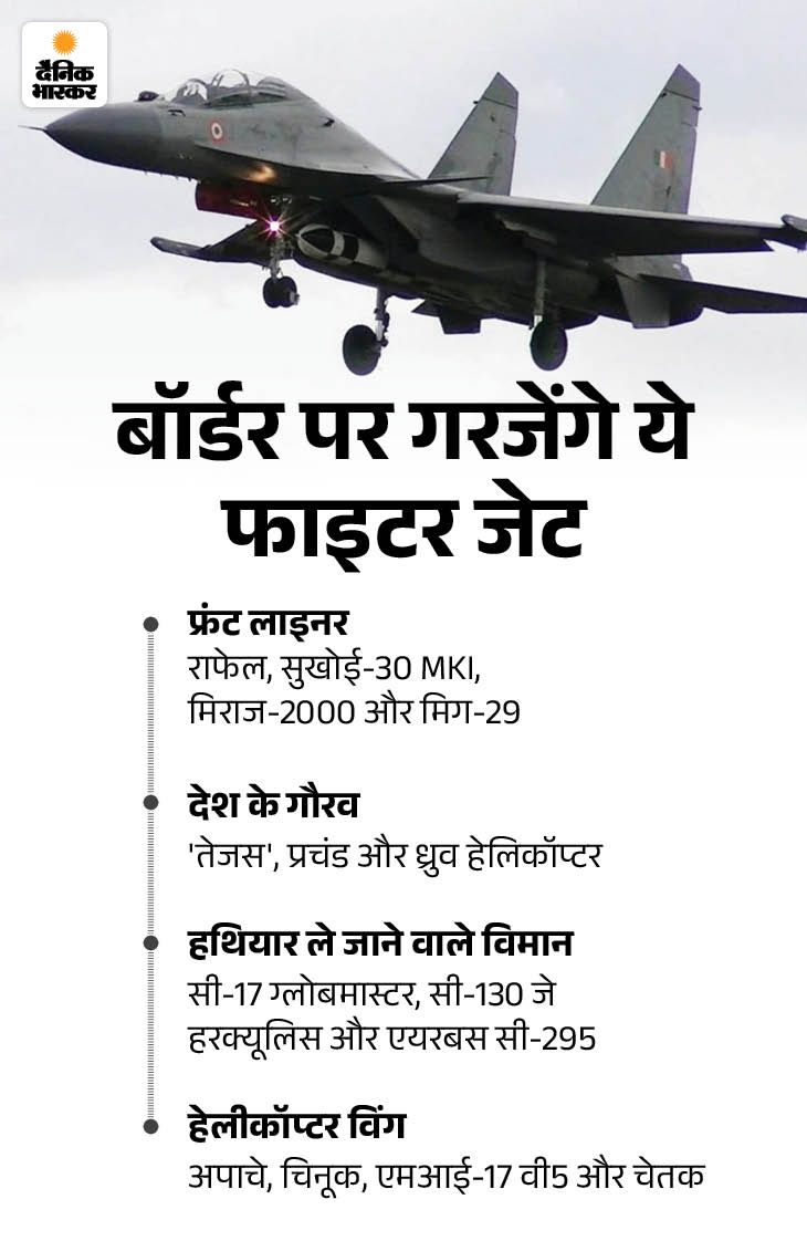 गोलाबारी और ऑपरेशन के लिए 77 फाइटर जेट और 43 हेलिकॉप्टर तैनात किए गए हैं। इतनी बड़ी संख्या में लड़ाकू विमान एक साथ उड़ान भरेंगे, जिससे साफ है कि भारतीय वायुसेना कई मोर्चों पर एक साथ प्रभावी कार्रवाई करने की क्षमता का प्रदर्शन कर रही है।