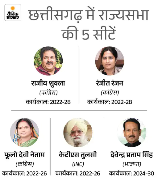 छत्तीसगढ़ से राज्यसभा के लिए वर्तमान में 5 सदस्य प्रतिनिधित्व कर रहे हैं। इनमें 2 सांसदों का कार्यकाल 9 अप्रैल को समाप्त हो रहा है, जबकि 2 सदस्यों का कार्यकाल 2028 और 2030 तक जारी रहेगा।