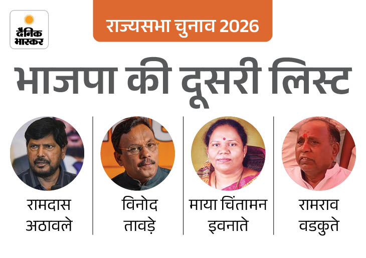 राज्यसभा चुनाव के लिए भाजपा ने 4 प्रत्याशियों के नाम वाली दूसरी लिस्ट जारी की है। इसमें केंद्रीय मंत्री रामदास अठावले, महाराष्ट्र भाजपा के अध्यक्ष विनोद तावड़े और माया चिंतामन इवनाते और रामराव वडकुते के नाम हैं।