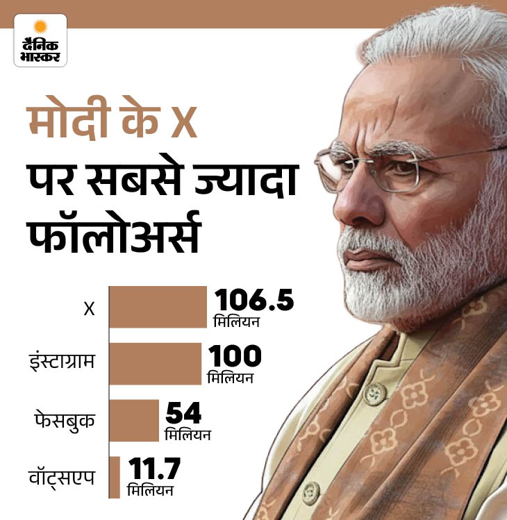 सोशल मीडिया X पर पीएम मोदी के 2024 में ही 100 मिलियन फॉलोअर्स का आंकड़ा छू लिया था। इस वक्त उनके X पर 106.2 मिलियन फॉलोअर्स हैं।