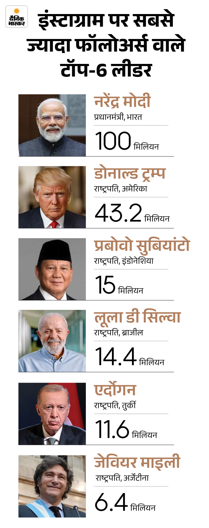 दुनिया के 5 बड़े लीडर्स के कुल फॉलोअर्स की संख्या मोदी के अकेले फॉलोअर्स की संख्या से कम है। ट्रम्प के बाद इंडोनेशिया के प्रेसिडेंट प्रबोवो सुबियांटो 15 मिलियन फॉलोअर्स का नंबर आता है।