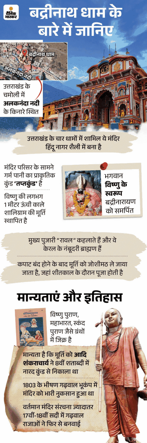 वहीं चमोली जिले में स्थित बद्रीनाथ धाम के कपाट 25 नवंबर को दोपहर 2 बजकर 56 मिनट पर शीतकाल के लिए बंद किए गए थे। फिलहाल बद्रीनाथ की शीतकालीन पूजा जोशीमठ के नरसिंह मंदिर में चल रही है।