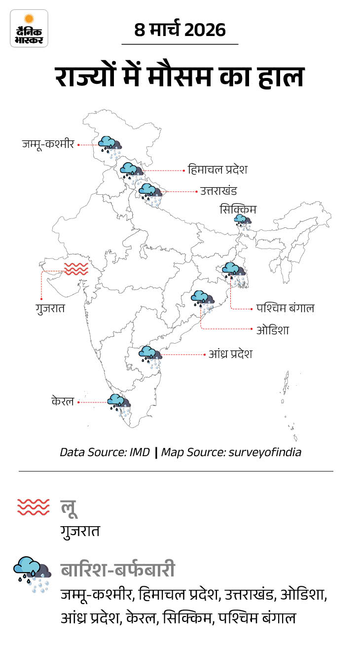 - 9 मार्च- ओडिशा, सिक्किम, पश्चिम बंगाल, झारखंड, बिहार, अरुणाचल प्रदेश में हल्की बारिश की संभावना है। जम्मू-कश्मीर, हिमाचल प्रदेश और उत्तराखंड में बारिश-बर्फबारी की संभावना है।