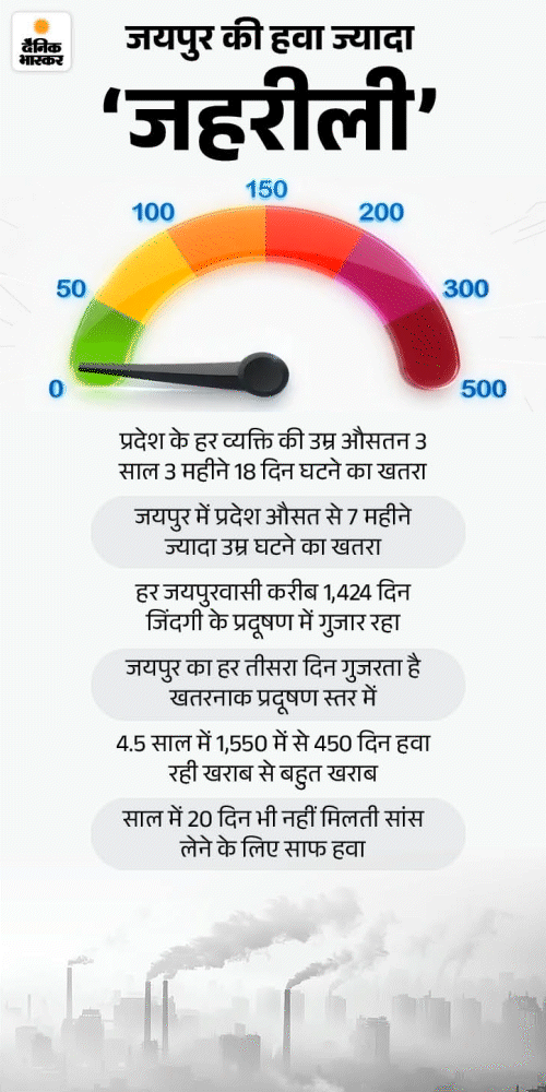 राजस्थान में बढ़ता प्रदूषण 8 करोड़ से ज्यादा प्रदेशवासियों की औसत उम्र घटा रहा है। राजधानी जयपुर में तो साल में 20 दिन ही शुद्ध हवा नसीब हो रही है। जहरीली हवा में मौजूद बारीक कण सिर्फ फेफड़े ही नहीं दिमाग की नसों तक पहुंच रहे हैं। किडनी तक डैमेज होने