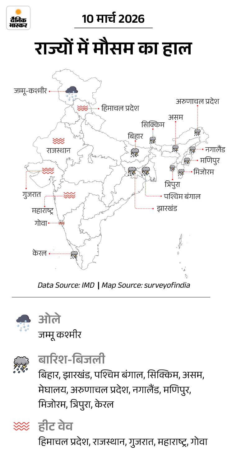 मंगलवार को बिहार, झारखंड, बंगाल, असम, मेघालय, अरुणाचल, नगालैंड, मणिपुर, मिजोरम, त्रिपुरा और केरल में बारिश का अलर्ट है। नगालैंड के कोहिमा, दीमापुर, सेमिन्यू और वोखा समेत कई जगहों पर सोमवार को भी करीब 40 मिनट तक बारिश-ओलावृष्टि हुई।