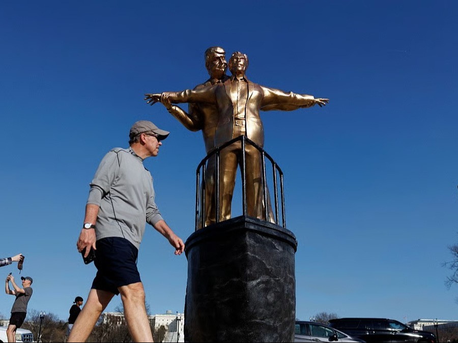 2025 में चर्चित जेफ्री और ट्रम्प की बेस्ट फ्रेंड फारेवर वाली मूर्ति।