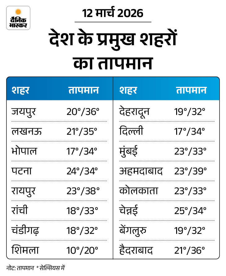 प्रदेश के 6 जिलों में अधिकतम तापमान 36 डिग्री सेल्सियस से ऊपर दर्ज किया गया। यह सामान्य से 7.5°C ज्यादा है। बुधवार को हरियाणा में नारनौल सबसे गर्म रहा, जहां अधिकतम तापमान 37.5°C दर्ज किया गया। वहीं सोनीपत में सबसे कम 14.4°C दर्ज किया गया। वहीं पंजाब के अमृतसर में गुरुवार सुबह बारिश से मौसम ठंडा हो गया है। पढ़ें पूरी खबर…