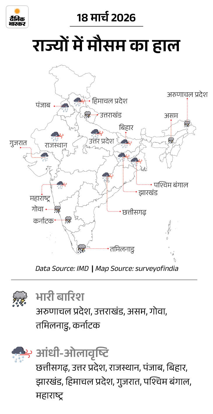 20 मार्च- जम्मू-कश्मीर, हिमाचल प्रदेश और उत्तराखंड में बारिश और बर्फबारी जारी रह सकती है। उत्तराखंड और पश्चिमी उत्तर प्रदेश में गरज-चमक के साथ 50–60kmph की रफ्तार से तेज हवाएं चल सकती हैं, जिनके झोंके 70kmph तक पहुंच सकते हैं। पंजाब, हरियाणा, चंडीगढ़ और राजस्थान में भी गरज-चमक, तेज हवाएं 40–50 किमी/घंटा और कुछ जगहों पर ओलावृष्टि की संभावना है। मध्य प्रदेश में भी कुछ स्थानों पर ओलावृष्टि हो सकती है।