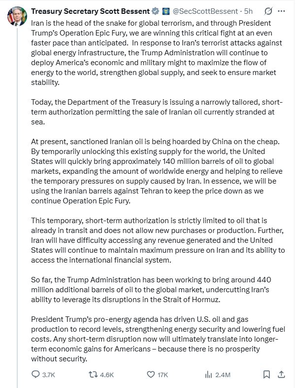 स्कॉट बेसेंट ने कहा कि दुनिया के लिए इस मौजूदा सप्लाई को अस्थायी रूप से खोलकर ग्लोबल मार्केट में लगभग 14 करोड़ बैरल तेल तेजी से आएगा। इससे दुनियाभर में ऊर्जा की उपलब्धता बढ़ेगी और सप्लाई पर जो अस्थायी दबाव बना है, उसे कम करने में मदद मिलेगी।