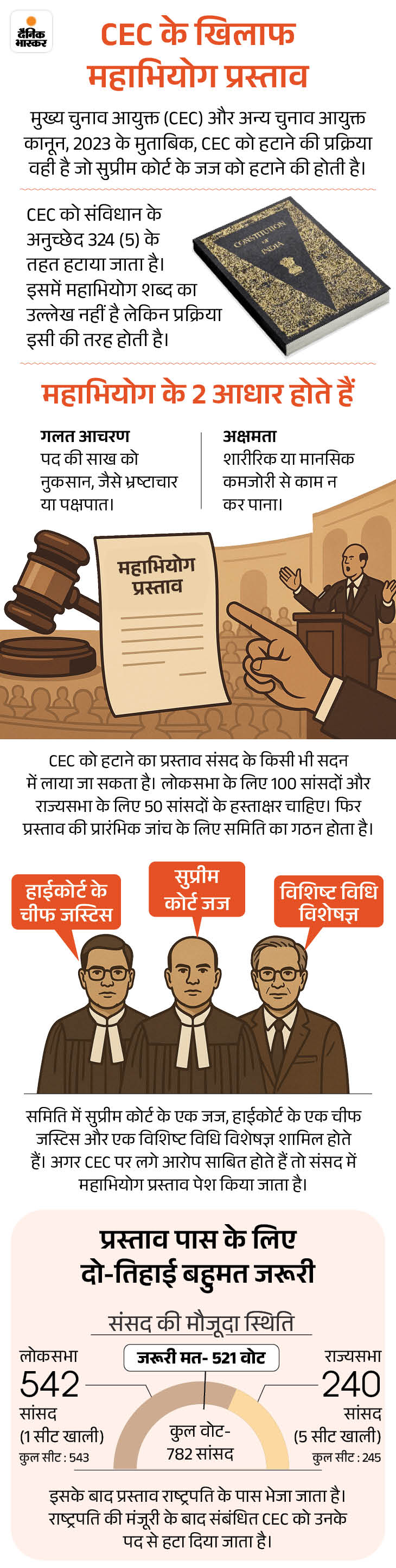 यह दावा किया जा रहा है कि विपक्ष मानसूत्र सत्र के दौरान CEC के खिलाफ महाभियोग प्रस्ताव ला सकता है। महाभियोग प्रस्ताव लाने के लिए 14 दिन पहले नोटिस देना जरूरी होता है।