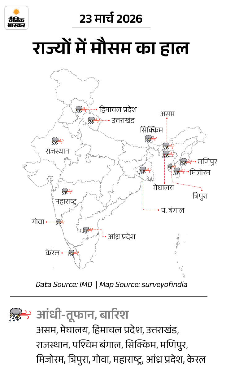 IMD ने आज हिमाचल, उत्तराखंड, पूर्वी राजस्थान, सिक्किम, असम, मेघालय, अरुणाचल, नगालैंड, मणिपुर मिजोरम, त्रिपुरा, मध्य महाराष्ट्र-मराठवाड़ा, आंध्र प्रदेश-रायलसीमा में आज आंधी-बारिश का अलर्ट है।