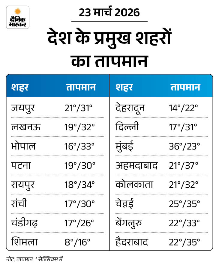 IMD के मुताबिक 26 मार्च से एक वेस्टर्न डिस्टर्बेंस एक्टिव होगा। जिसके असर से तेज बारिश, आंधी के हालात बनेंगे। लेकिन उत्तर-पश्चिम, मध्य और पूर्वी भारत में अगले 5 दिन में तापमान में 4-7°C तक की बढ़ोतरी हो सकती है।