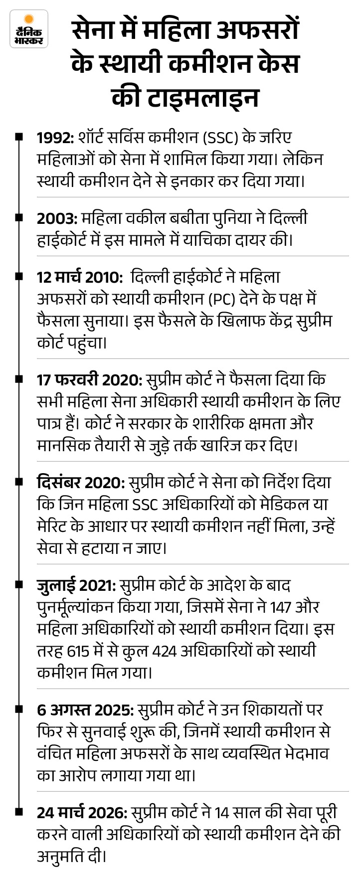 23 साल पहले 2003 में इस मामले में महिला वकील बबीता पुनिया ने दिल्ली हाईकोर्ट में याचिका दायर की थी। उनके बाद 9 महिला अफसरों ने 2009 तक हाईकोर्ट में इसी मुद्दे पर अलग-अलग याचिकाएं दायर कीं। 2010 में दिल्ली हाईकोर्ट ने इन याचिकाओं पर फैसला सुनाया और महिलाओं को सेना में स्थाई कमीशन देने का आदेश दिया।