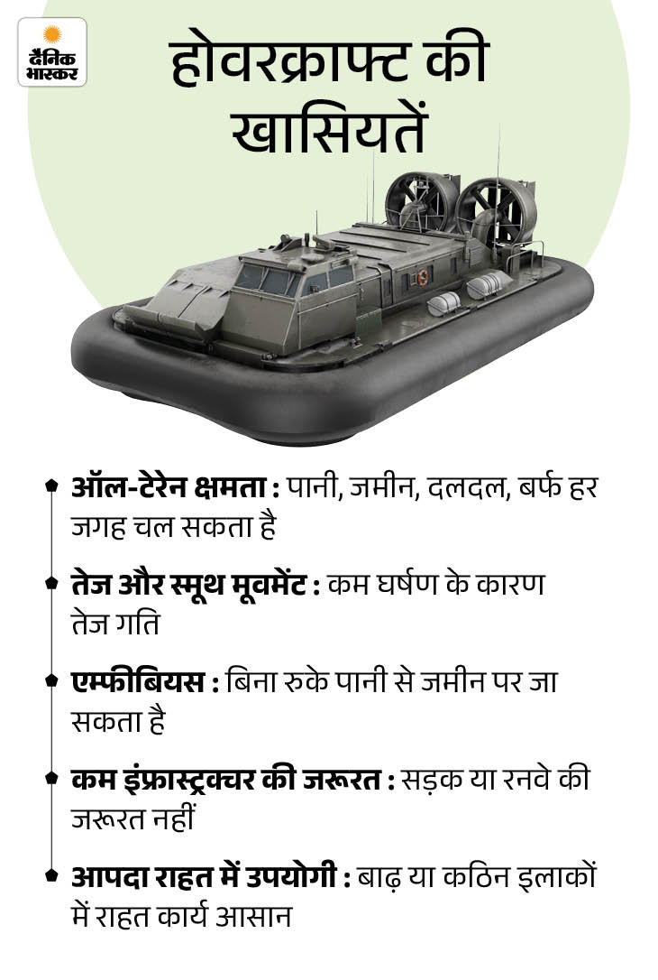 इंडियन कोस्ट गार्ड के लिए हेवी ड्यूटी एयर कुशन व्हीकल्स (होवरक्राफ्ट) को मंजूरी मिली। इनका उपयोग तटीय गश्त, सर्च एंड रेस्क्यू और लॉजिस्टिक्स सपोर्ट में होगा।