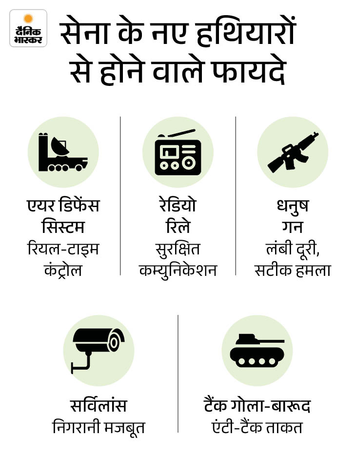 सेना के लिए एयर डिफेंस ट्रैक्ड सिस्टम, आर्मर पियर्सिंग टैंक गोला-बारूद, हाई कैपेसिटी रेडियो रिले, धनुष गन सिस्टम और रनवे इंडिपेंडेंट एरियल सर्विलांस सिस्टम को मंजूरी मिली।