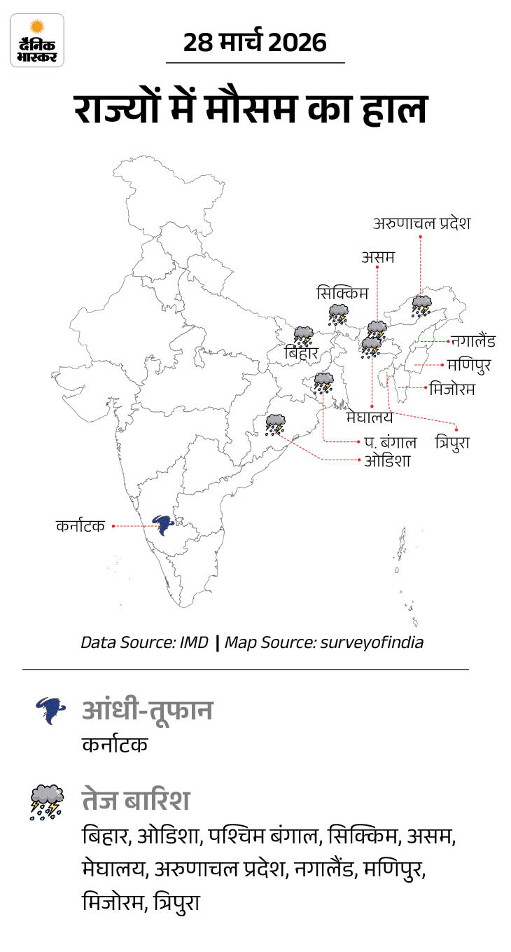 29 मार्च- अरुणाचल प्रदेश, असम, मेघालय, नागालैंड, मणिपुर, मिजोरम और त्रिपुरा में तेज बारिश की आशंका है। महाराष्ट्र, तेलंगाना, कर्नाटक और केरल में हल्की बारिश की संभावना।