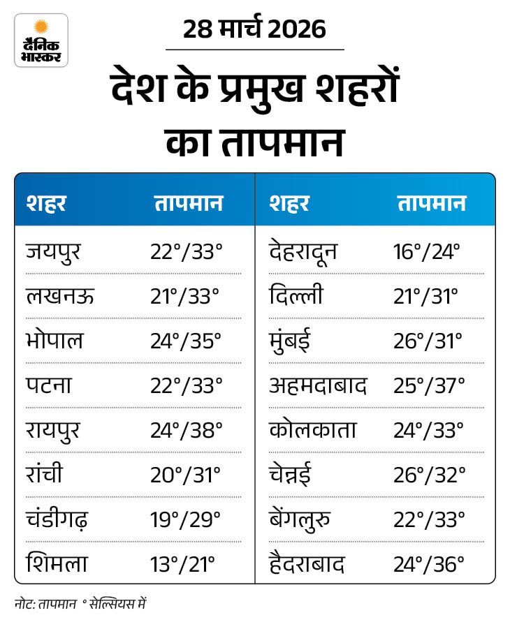 30 मार्च- पश्चिम बंगाल, सिक्किम, असम, मेघालय, मध्य प्रदेश, छत्तीसगढ़ में हल्की बारिश की संभावना है।