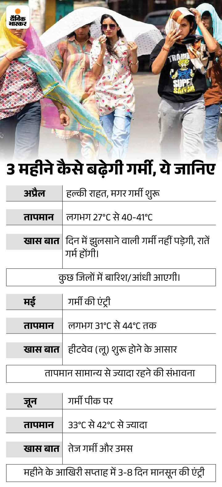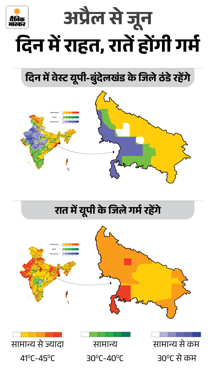 जवाब. नहीं, ये पूरी तरह से ठीक नहीं है। यूपी के मौसम को दो हिस्सों में समझते हैं। पहला- पूर्वांचल का, दूसरा- पश्चिम यूपी। पूर्वांचल में अप्रैल से जून महीने तक हीटवेव (लू) लोगों को परेशान करेगी। यहां दिन का तापमान सामान्य से ज्यादा यानी 41 डिग्री सेल्सियस से 45 डिग्री सेल्सियस तक रह सकता है।