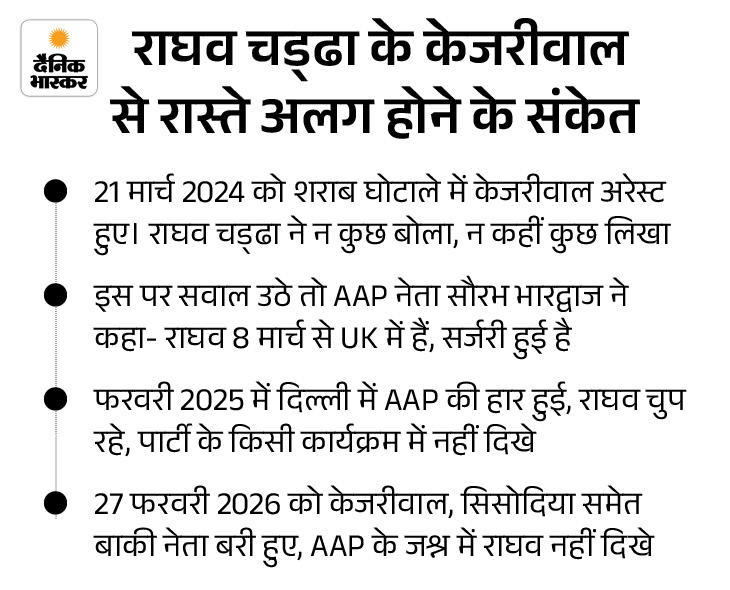पंजाब सिसोदिया को सौंपा तो चड्ढा ने राह बदली इसी बीच फरवरी 2025 में दिल्ली में AAP की हार हो गई। जिसे देखते हुए अरविंद केजरीवाल ने पंजाब पर फोकस करना शुरू कर दिया। जरनैल सिंह की जगह मनीष सिसोदिया को प्रभारी बना दिया। चड्ढा की जगह सतेंद्र जैन को सहप्रभारी लगा दिया। इसके बाद राघव चड्ढा ने राज्यसभा में जनहित के मुद्दे उठाने शुरू कर दिए। AAP नेता सौरभ भारद्वाज और अनुराग ढांडा ने कहा कि वह पार्टी के लिए अलॉट टाइम में AAP के मुद्दे नहीं उठा रहे थे। यहां तक कि पश्चिम बंगाल को लेकर CEC के खिलाफ प्रस्ताव में साइन करने से भी इनकार कर दिया। CM भगवंत मान ने भी कहा कि पार्टीलाइन पर नहीं चल रहे थे। जिस वजह से उन पर कार्रवाई हुई।