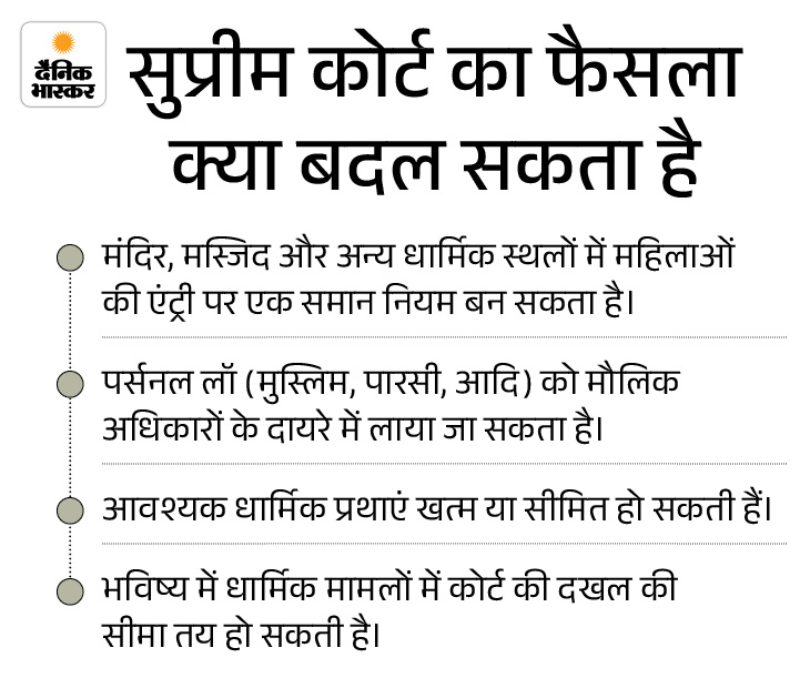अगर सुप्रीम कोर्ट की 9 जजों की बेंच केरल हाईकोर्ट और सुप्रीम कोर्ट के 5 जजों की संविधान पीठ के फैसले को बरकरार रखती है तो भविष्य में धार्मिक मामलों में कोर्ट के दखल की सीमा तय हो सकती है।