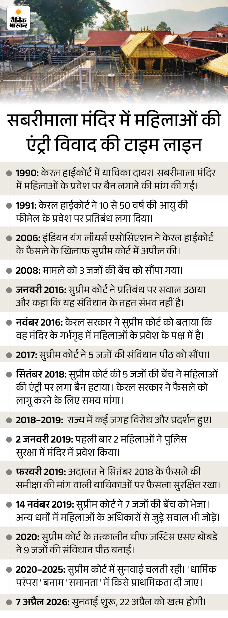 - 1990 में मंदिर में महिला की एंट्री को लेकर विवाद उठा। समय के साथ स्थानीय कोर्ट में मामला चला बाद में सुप्रीम कोर्ट पहुंचा। 2006 में सुप्रीम कोर्ट ने संबंधित पक्षों को नोटिस जारी किए थे। केस 2008 में 3 जजों की बेंच को सौंपा गया।