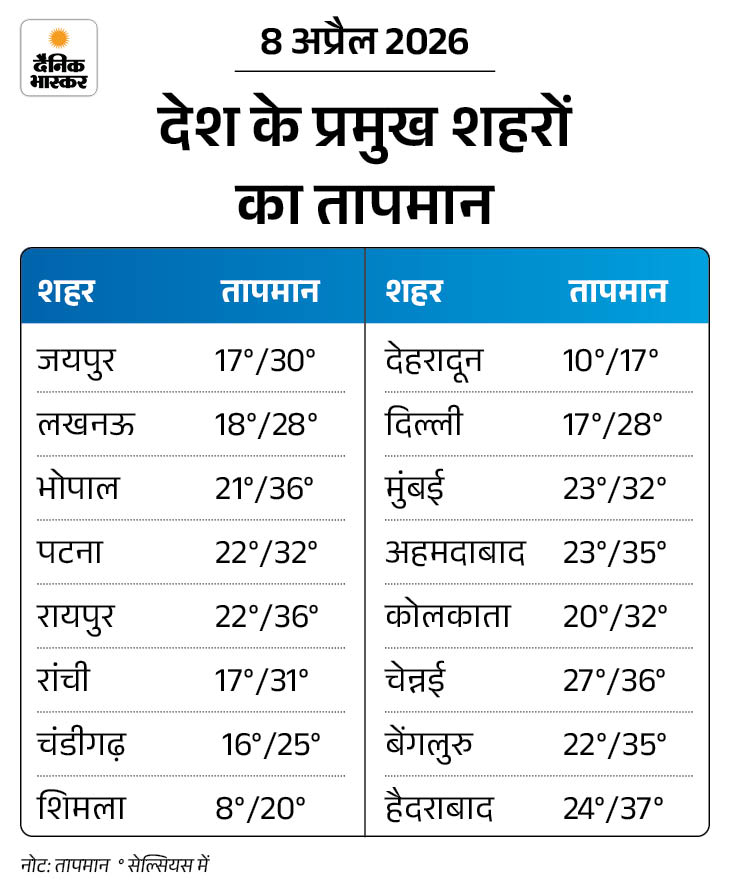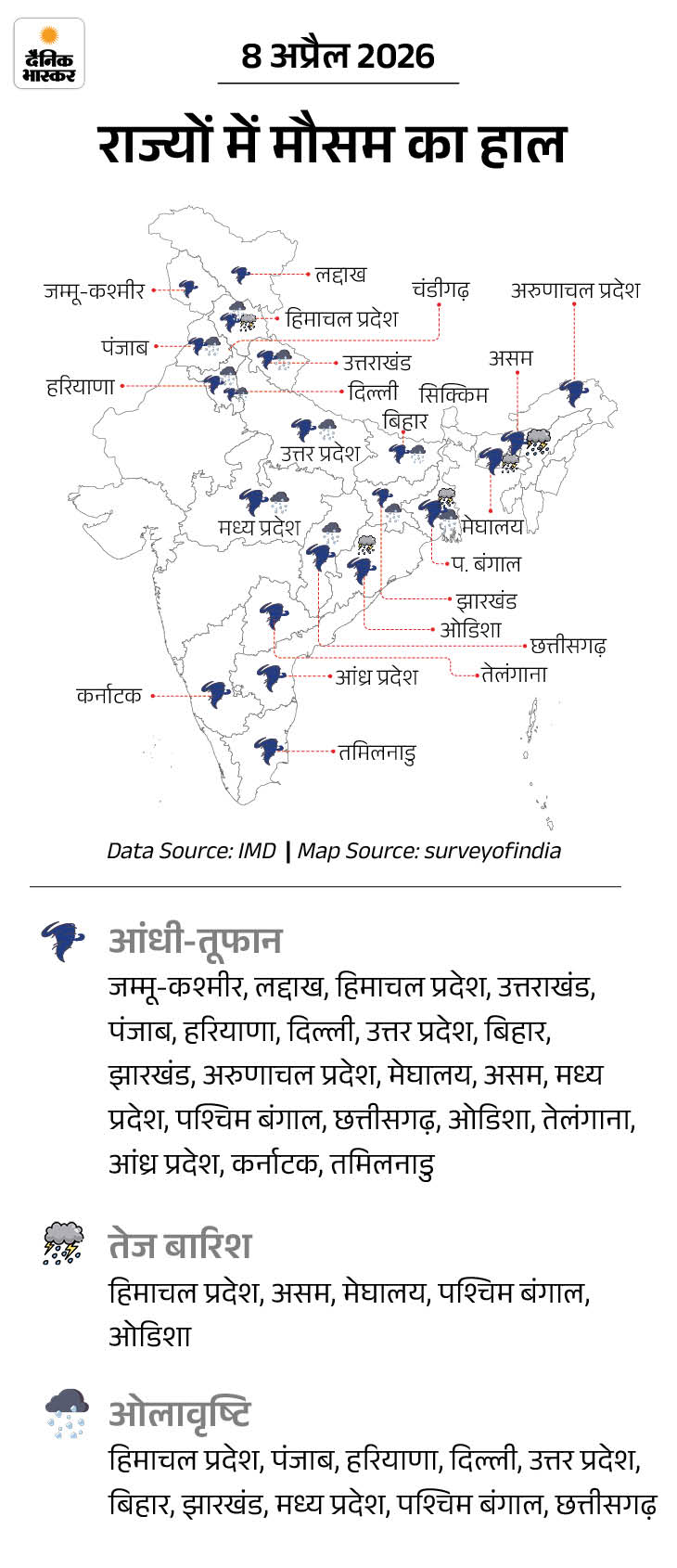 8 अप्रैल: जम्मू-कश्मीर, हिमाचल, उत्तराखंड, पंजाब, हरियाणा, दिल्ली, यूपी में गरज-चमक के साथ तेज बारिश की संभावना है। 40 से 60 किमी/घंटा की रफ्तार से हवा चल सकती है। बिहार, झारखंड, बंगाल, मध्य प्रदेश और छत्तीसगढ़ में बारिश के साथ ओले गिरने की आशंका।
