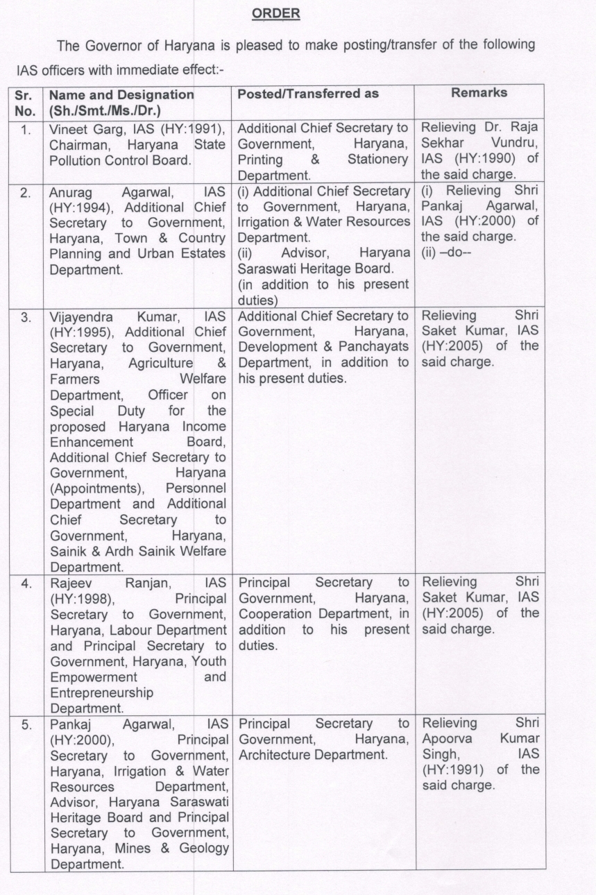 सी.जी. राजिनी कान्थन: फाइनेंस विभाग (हरियाणा-III) के कमिश्नर एवं सेक्रेटरी थे, अब माइंस एवं जियोलॉजी विभाग के कमिश्नर एवं सेक्रेटरी भी होंगे।