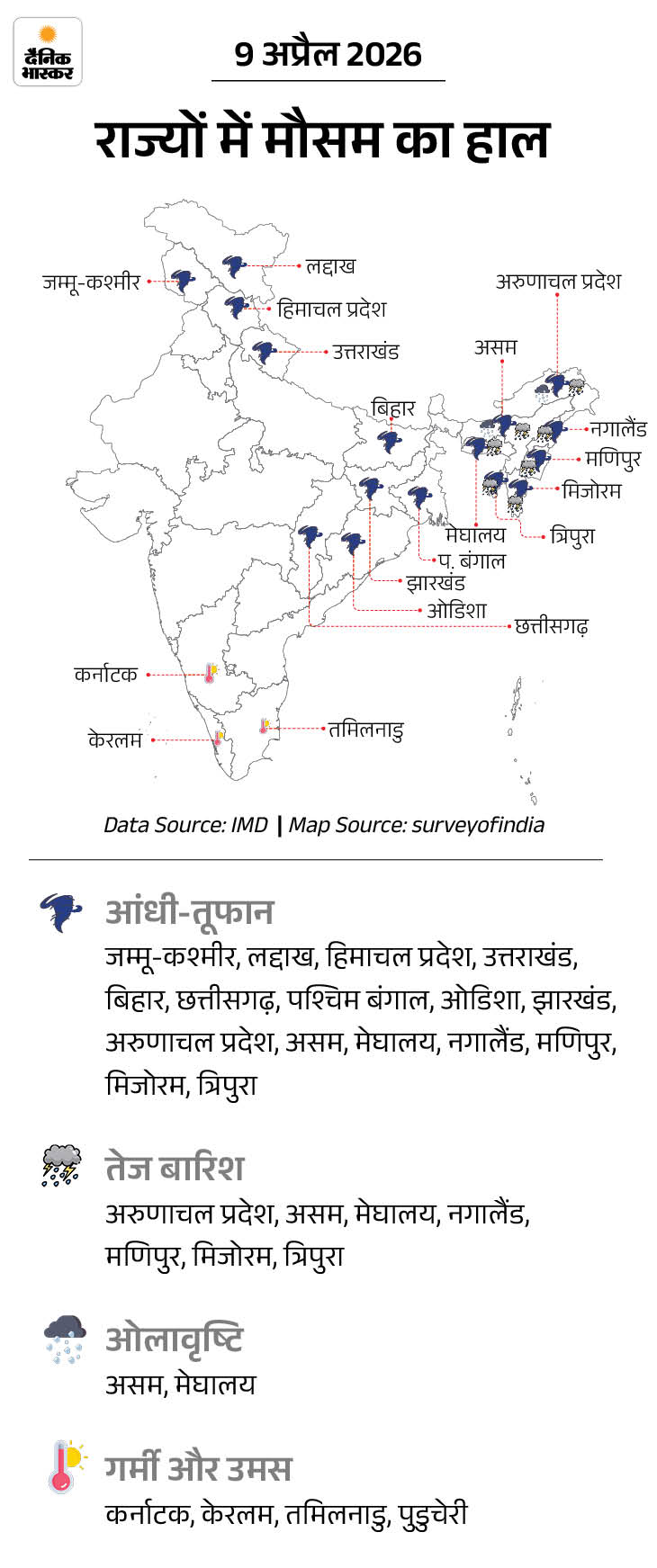 - 9 अप्रैल- जम्मू-कश्मीर, हिमाचल प्रदेश और उत्तराखंड में बर्फबारी की संभावना। पंजाब, हरियाणा, दिल्ली, उत्तर प्रदेश और राजस्थान में कहीं-कहीं हल्की बारिश। बिहार, झारखंड, पश्चिम बंगाल और ओडिशा में 30-50kmph रफ्तार की हवा चल सकती हैं। असम और मेघालय में तेज बारिश।