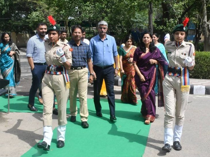 चीफ गेस्ट का स्वागत करते हुए कॉलेज स्टाफ।