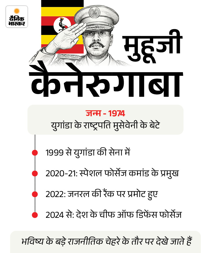 मुहूजी कैनेरुगाबा 1999 से युगांडा की सेना में रहे है। उन्हें राजनीति में अपने पिता का उत्तराधिकारी माना जाता है।