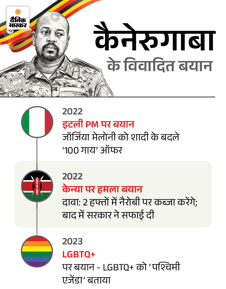 उस समय उन्होंने कहा था कि अगर इटली ने प्रस्ताव ठुकराया, तो रोम पर कब्जा करना पड़ेगा। इस बयान के बाद उनके पिता राष्ट्रपति मुसेवेनी को माफी मांगनी पड़ी थी।