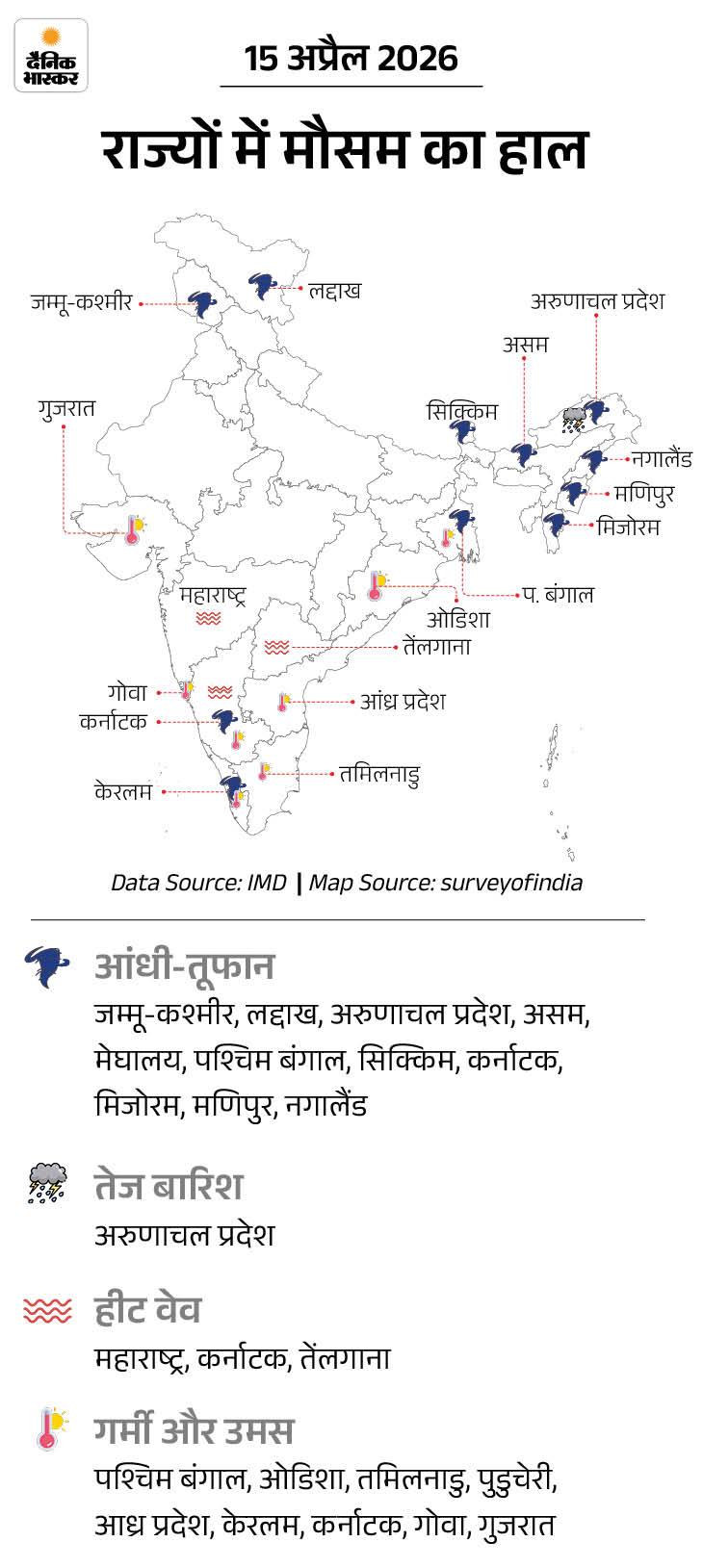 16 अप्रैल: असम, मेघालय, अरुणाचल प्रदेश, नागालैंड, मणिपुर, मिजोरम और त्रिपुरा में बारिश के साथ 30-50 किमी/घंटा की रफ्तार से हवाएं चल सकती है। जम्मू-कश्मीर और लद्दाख में हल्की बर्फबारी की संभावना है। पश्चिम बंगाल और सिक्किम में भी हल्की बारिश हो सकती है। मध्य प्रदेश और छत्तीसगढ़ में लू चलने की शुरुआत होगी। तेलंगाना और कर्नाटक के कुछ हिस्सों में तापमान बढ़ेगा।