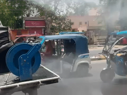 दोपहर के समय गर्मी थामने के लिए सड़कों पर पानी का छिड़काव किया जा रहा है।