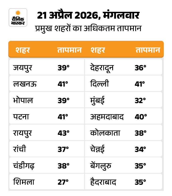- उत्तर-पश्चिम भारत में गर्मी का असर जारी रहेगा। झारखंड, ओडिशा और बिहार में भी गर्म और उमस भरा मौसम रहेगा।