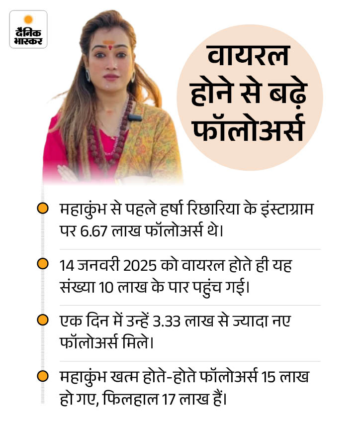 4 जनवरी 2025 को प्रयागराज महाकुंभ में निरंजनी अखाड़े की पेशवाई निकली थी। उस वक्त 30 साल की मॉडल हर्षा रिछारिया संतों के साथ रथ पर बैठी नजर आई थीं। पेशवाई के दौरान हर्षा रिछारिया से पत्रकारों ने साध्वी बनने पर सवाल किया था।