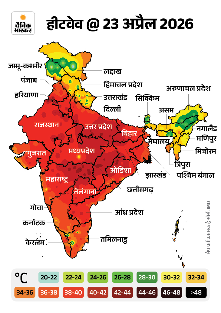 देश के आधे से ज्यादा राज्यों में हीटवेव जारी है। बिहार, मध्य प्रदेश, राजस्थान, छत्तीसगढ़, ओडिशा, उत्तर प्रदेश और महाराष्ट्र के कई शहरों में पारा 40°C से 45°C के बीच बना हुआ है।