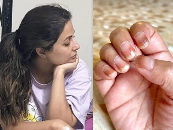 ये रिश्ता क्या कहलाता है और कसौटी जिंदगी की जैसे शोज का हिस्सा रहीं हिना खान इन दिनों स्टेज 3 कैंसर से जंग लड़ रही हैं। उन्हें लगातार कीमोथैरेपी लेनी पड़ रही है। एक्ट्रेस अक्सर सोशल मीडिया पर अपने हेल्थ अपडेट देने के साथ-साथ लोगों को मोटिवेट करती नजर आती हैं। हाल ही में एक्ट्रेस ने एक तस्वीर शेयर कर बताया है कि कीमोथैरेपी से उनके हाथ की उंगलियों के नाखून सूख गए हैं और कई बार उखड़ भी जाते हैं।