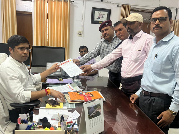 कलेक्टर को ज्ञापन सौंपते कार्मिक।