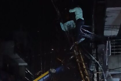 ट्रैक्टर के जैक से रोका जमीन पर आता खंबा।झांसी में मंगलवार की…